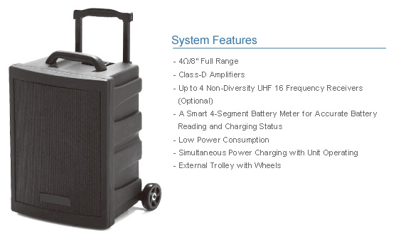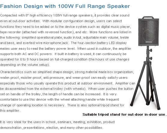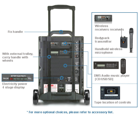 | Function | Electricity Power 4-Stage Display/Stereo Line-in (6.3Ø, RCA) MIC Input Jack (6.3 Øx2, XLRx1) Fix Handle/External Trolley with Wheels |